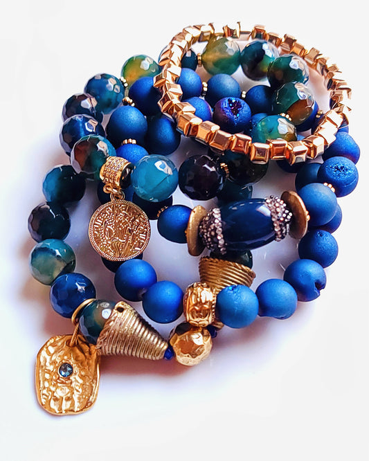 Blue Persuasion Druzy Agate Hematite and Agate 5-strand Stak Set