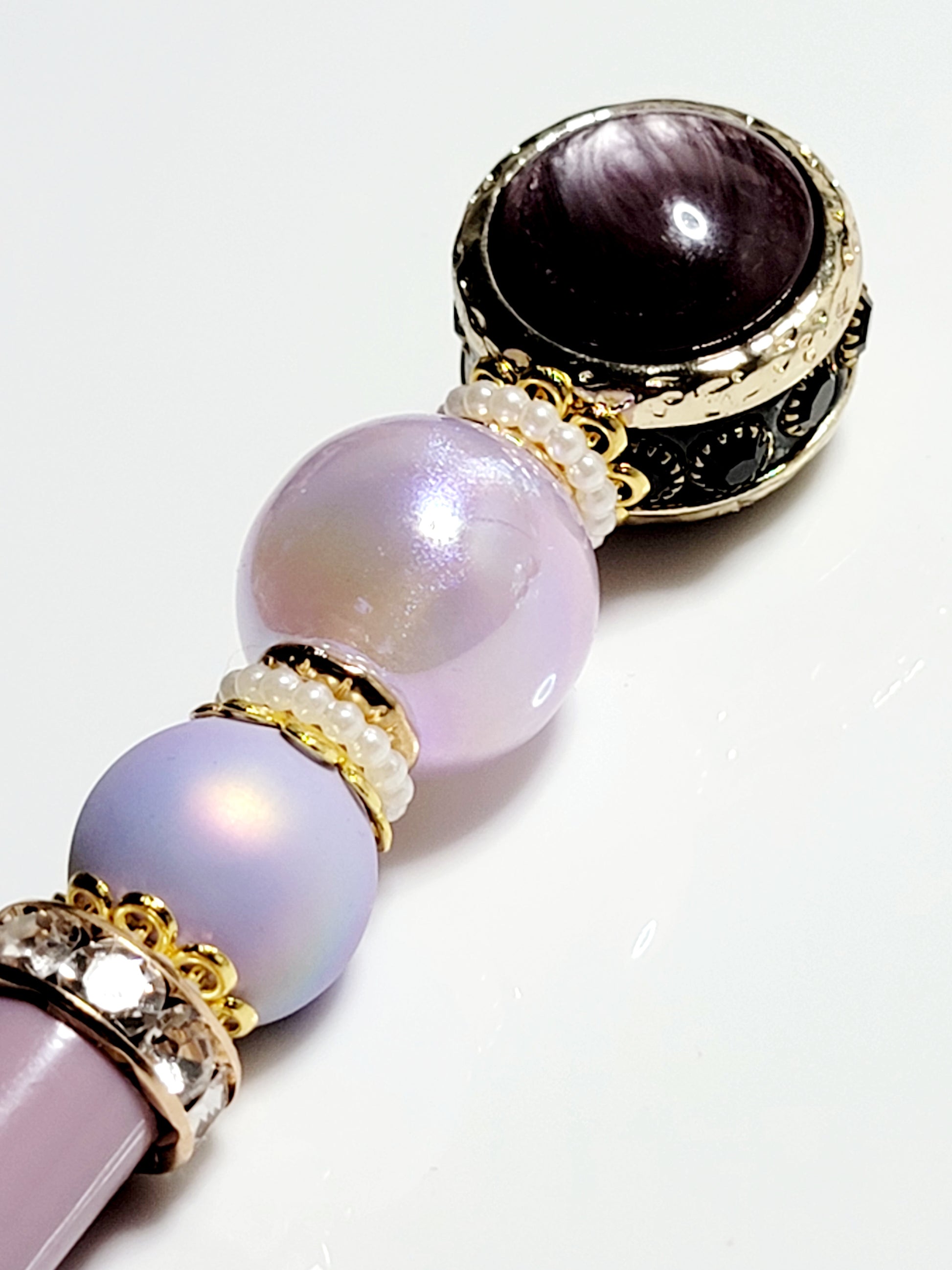 The Lavender Fairy has to have a soft and elegant pen just as beautiful as her to write her thoughts. Obisidian like silver sheen in this purple hued orb topper with black rhinestones. Accentuated with soft shades of purple beads. Finished with gold filigree, pearl and rhinestone accents. Lavender pen case.